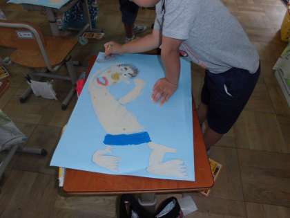 シャワーを浴びている自分です。画用紙全面を使って,みんなのびのびと描いています。