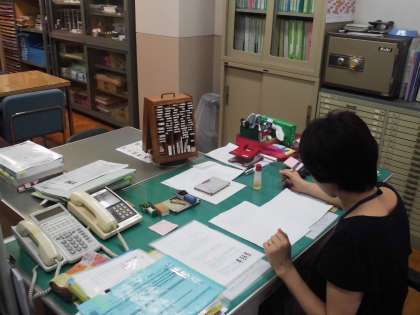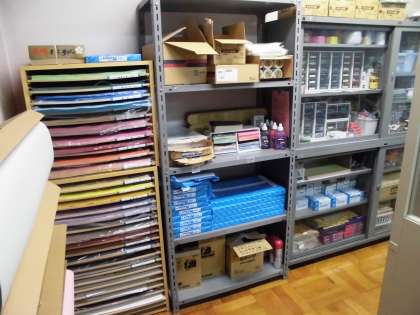 事務室に入ると,色模造紙,色画用紙,そして,ロッカーには,赤ペン,チョーク,黒板消しなど事務用品があります。
