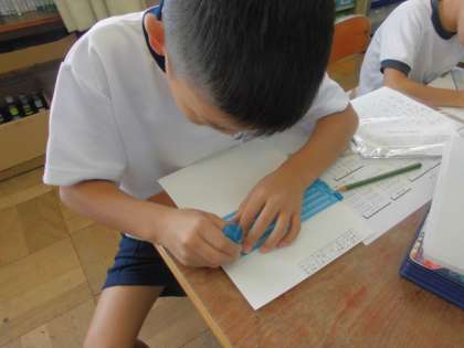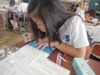 現在,国語科で「だれもが関わり合えるように 」で点字などに関する学習をしています。自分のテーマに沿って調べて書き,発表するという内容ですが,百聞は一見に如かずということで,教科書を読むだけでなく,実際に点字器で点字を打ったり,読んでみたりの体験をしていました。