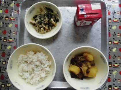 9月24日(火)の給食は,肉じゃが,切り干し大根の煮つけ,麦ご飯,牛乳です。