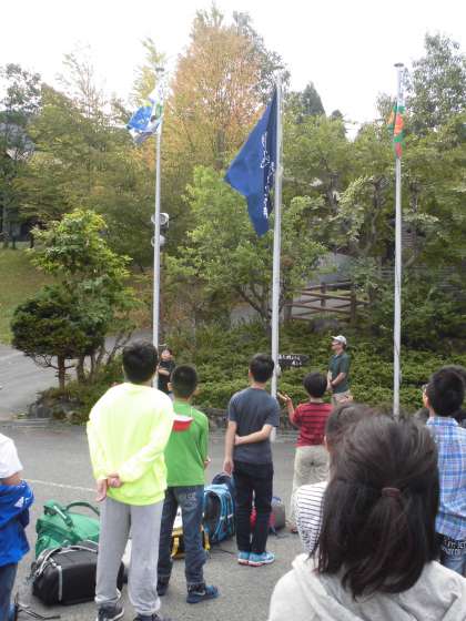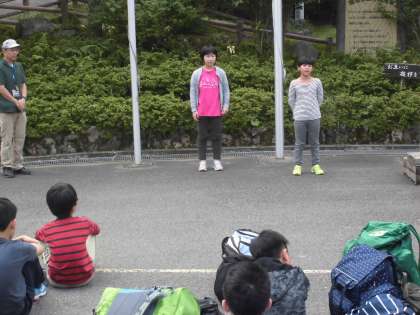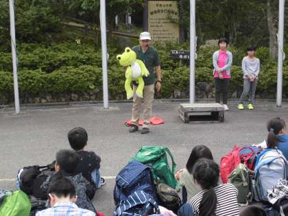 山の家の所員の方による山の家のマスコット「ハナコロ」の腹話術で危険生物の注意がありました。