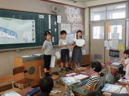 「くじらぐも」の山場の場面「空のたび」を学習しました。「くじらぐもの上で,みんなはどんなお話をしたのかな。」というめあてで,みんなそれぞれの思いを吹き出しに書きました。そのあといすの上に立って,くじらぐもの気分をちょっぴり味わいながら,吹き出しの言葉を順番に発表しました。「ぜったいここのままおりたくないよ。」など,お話の子どもたちになりきって,かわいい言葉を考えることができていました。