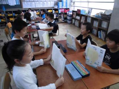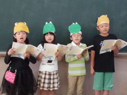 国語の学習で「お手紙」のお話の音読げき発表会をしました。がまくん・かえるくんにわかれて,「 」のところの読み方を考えました。少し動きも入れるなど,自分なりに工夫をして読みました。各グループしっかりと大きな声で工夫しながら読んでいました。