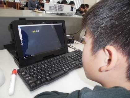 タブレットを使って,プレゼン作りを練習中