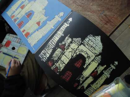 図画工作の学習では,世界遺産を版画の作品にしています。日本の富士山や厳島神社,ピラミッドやタージマハルなどを一版多色刷りで表現しています。どんな作品が仕上がるが楽しみです。