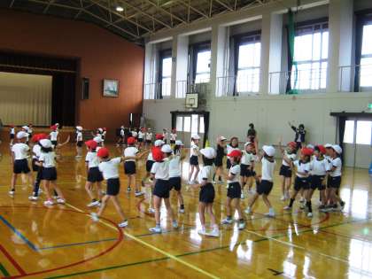 今週の土曜日にある運動会に向けて各学年いっしょうけんめい練習をしています。今日は運動場が使えないため体育館で練習しました。1・2年生の子どもたちは、団体演技で「いなりONドーズ」をします。その一つの出し物に「いなり音頭」があります。歌を歌いながら、みんなで輪になっていなり音頭を踊っている姿がとてもかわいいです。当日を楽しみにしてください。