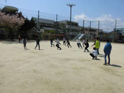 太陽のもとで互いの距離感を注意しながら運動をする様子もありました。