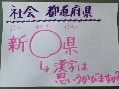 都道府県のプリントの課題も見ていました。難しい漢字がたくさん出てきましたね。漢字ドリルの中で全て出てきているので,細かいところや書き順も確認できているかなと思います。特に難しい「新潟県」の「潟」。気をつけて書いてくださいね。