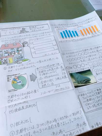 みなさんが毎日使っている「水」。朝起きて顔を洗う時,家から帰った時,その他にも様々な場面で「水」を使っていますね。京都府の学習が終われば,次は水の学習です。毎日使っている水がどこからやってきて自分たちの家に届けられているのか,これからどのように水を使っていけばよいのか,そんなことを学習していきます。水のプリントもできました。19日の学習相談日の時にみなさんに渡します。