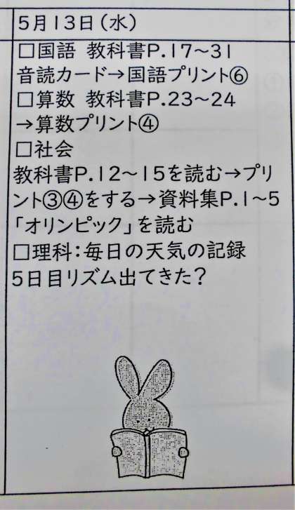 19日(火)の学習相談日が決まりましたね。校区を北と南に分けてクラスを半分にして学習することになりました。自分がどちらになるのかは,HPやメールを見てください。町別で分けてありますよ。相談日には,みんなからの課題を預かったり,新しい課題を渡したり,運動をしたり,と考えています!(お家の判断で登校しない人には,先生が届けるので,安心してください。これまでの課題と交換するので準備しておいてね。)