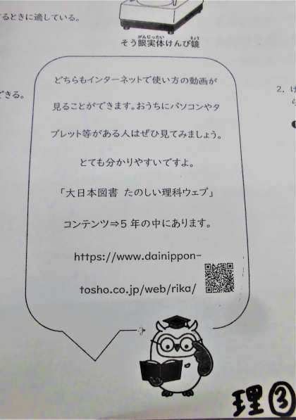 プリントの3にQRコードを載せているので,ぜひ動画で使い方を見てみてください!先生は理科が好きで,学生のころ,けんび鏡を使って植物の細胞を見たときにすごく感動したことを覚えています。普段見ることができない『小さな世界』を見ることができるけんび鏡はとても素晴らしい道具です。