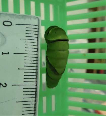 今朝見ると、アゲハのよう虫がまた変身していました。しいく箱のふたにくっついていて形が少し変わっています。大きさは2cmと小さくなっています。じっとして動かなくなりました。