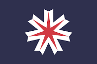 1青色に真ん中が白と赤の旗