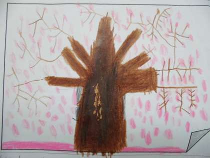 1まい目は,「まんかいの さくら」です。こうえんでまんかいにさいていた さくらを見たそうです。風がつよくふいていて,口の中に花びらが入ってくるほどだったそうです。絵を見たらたしかに 花びらが いっぱいに広がっていますね。口をおさえながら,さくらの木を見上げてたんでしょうね。