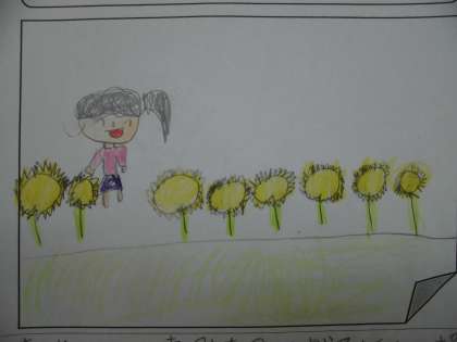 2まい目は「いっぱいさいていた たんぽぽ」です。おばあちゃんがすんでおられるところへ行ったときに,しばふにいっぱいさいていたそうです。さわってみたら くすぐったかったそうです。たしかに,絵の中の女の子は,さわりながら,にこっとわらっていますね。