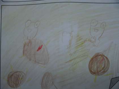 3まい目は「とうみんからおきた かえる」です。さといもほりに出かけたら,ふゆのあいだとうみんしていたかえるたちが いっぱい出てきたんだそうです。とっても元気なかえるたちだったそうです。春がきて かえるたちも うれしかったんでしょうね。
