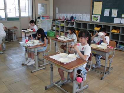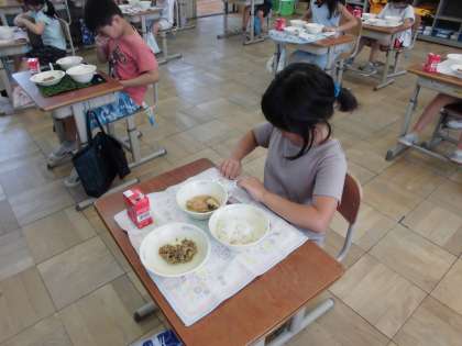 「よく考えたら,ほぼ3か月ぶりの給食やなあ・・・。」とみんなで,しみじみしながら久しぶりの給食を味わいました。あちこちでおかわりのリクエストもあって,声には出せないけど,「ああ,おいしい。」というみんなの気持ちが伝わってきました。