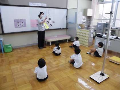 保健室の使い方を教えてもらい,身長・体重・視力をはかってもらいました。
