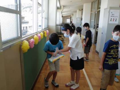 2年生の子たちのはじめの言葉もばっちりで,そのあとペアに分かれてたんけんにまわりました。手つなぎのかわりに作ったわっかをお互いにもって,順番に教室をまわっていきました。シールをはるところをやさしく教えてあげたり,ポスターに書いていないことまで,つけたして説明してくれていたり,1年生のためにがんばろうという思いがしっかりと伝わってきて,うれしかったです。