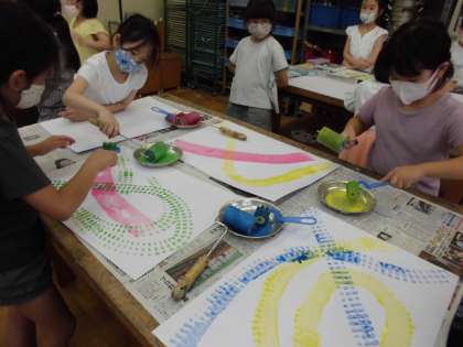 図工「ひみつのたまご」はたまごが完成して,いよいよ割ったたまごから飛び出してくるものを描いていきます。そこで今日は,割れたたまごをはりつける画用紙にローラーで楽しい模様をつけました。偶然にできる濃い薄いがローラーの楽しさです。今日も,あちこちから「わー!」とという歓声がおこっていました。