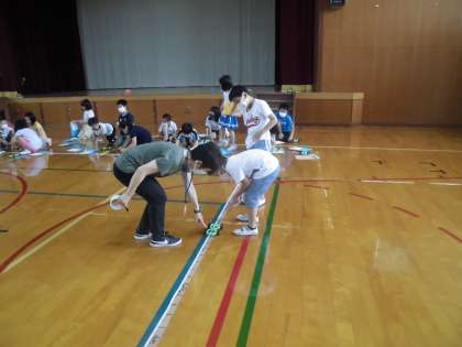 7月7日(火),体育館で,ゴムの力でどこまで車が走るか計測しました。
