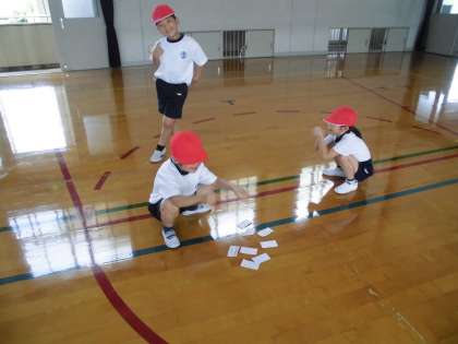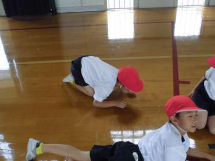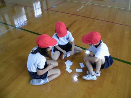 今日の体育科「むしになって」は,グループ活動を行いました。各グループに配られたお題カードをめくり,そのカードに書かれていた条件の虫になります。ただ虫になるだけでなく,今回はグループで動きを相談します。ソーシャルディスタンスをとりながら,意見を出し合い,そしてみんなで動きを試してみます。一人で考えるよりも,色々な考えが出てきました。