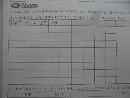 5年生から新しく始める家庭科に先週から取り組み始めました。1時間目は,家庭内の仕事について学習しました。家の中には,どんな仕事があるんだろう?炊事,洗濯,掃除,買い物・・・。もちろん,献立決め,トイレットペーパー補充,シャンプーの詰め替えなど,名のない仕事がたくさんありますよね。子どもたちは,改めて家の仕事について考えることで,「こんなにあるん!?」「わたしたち,あんまりやってないなー。」「家の人ってすごいな〜。」「自分の仕事もして家事もして,ぼくたちのこともして・・・」とお家の人に感謝している姿が見られました。普段はなかなか意識できないようですが,プリントに仕事を書きだし,その仕事をしている人を確認することで,改めて実感がわいたようです。これから,自分でできることを増やすために,家庭科で様々なことに挑戦していきます。ぜひ,お家で発揮する場を与えてあげてください。