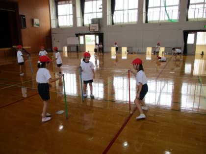 体育科「ようぐあそび」で棒を倒さず交換する学習をしました。初めは二人組で行いました。徐々に人数を増やし,難易度が上がっていきました。最後は,7人組になり,棒を交換していました。なかなか成功しませんでしたが,あきらめず,時間いっぱい活動できました。