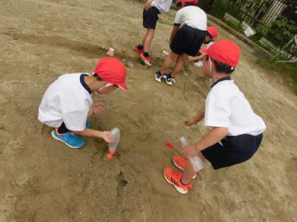 どれくらい水が飛ぶか競争したり,立てた旗を狙って水を飛ばしたり,砂場でトンネルや川を作ったり,しゃぼん玉を飛ばしたり…。友達と協力したり,一人でじっくり工夫を考えたり…。いろんな遊びを楽しみました。