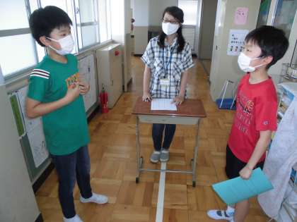外国のお客さんに日本の行事を紹介するという内容の本単元,意識の高い子は,週末に家で練習してきたようで,教科書通りではないオリジナリティ溢れる紹介で盛り上がりました。(例)『In summer, we have MOTOMIYA FESTIVAL. You can eat SYAKASYAKA POTATO!(夏は本宮まつりがおすすめです。屋台でシャカシャカポテトが食べられますよ!)』など,ゲスト側や担任も聞いていて思わずニコリとしてしまうナイスパフォーマンスがたくさんみられました。初めてなので,少しとまどうかな…の不安をよそに,カヤン先生も驚きの全員合格,花丸の人もたくさんいました!