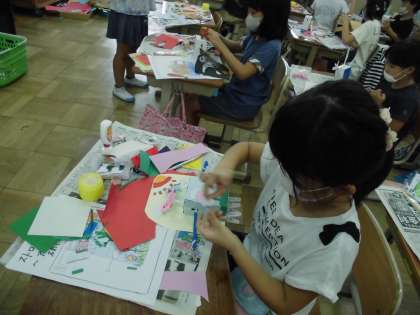 2学期スタートの図工の学習は,ストローで動く仕組みを作って,その動きから思いついた作品作りに取り組んでいます。動きは2パターンあって,自分で選んだ動きからそれぞれ思いを広げて製作真っ最中です。細かい模様や形も一生懸命にはさみで切ってがんばっています。