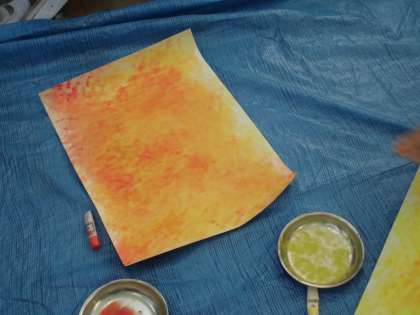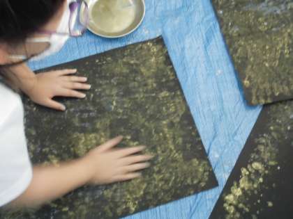 絵の具を使い,手を使って画用紙にペタペタペタ,,と。
