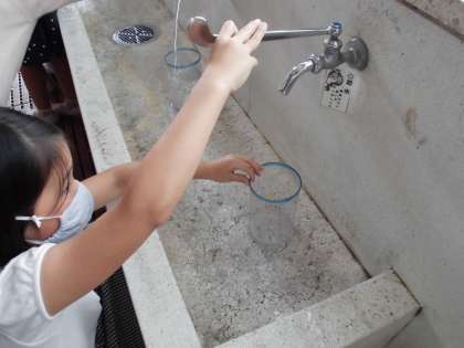 授業の最後の方で「家の中で リットルが書いてあるものを見たことある?」とたずねてみると,計量カップのことを発表する子がたくさんいて,何気なく見ていても心に残っているんだなと感じました。帰りの用意の時には,自分の水筒を隅から隅まで眺めている子達でした。