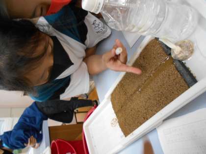 という問題を解決するために,自分たちで小さな水の流れを作って実験して,その様子を観察してみました。