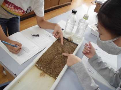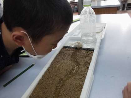 みんな大好きな理科の実験。今回は,流れる水のはたらき,曲がった川ではどのように地面が削られていくのかを学習しました。だんだんと水の量を増やし,観察していきました。「曲がっているところの外側が削られている!」「流れる水の量を増やすと,すごい勢いで削られていく!!」とたくさんの発見があったようです。