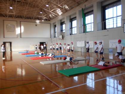 今日はマット運動1時間目だったので,まずは体をマットに慣らすことからスタートしました。マットの上をまっすぐ転がるのは難しいようです。倒立につながるロバキックという足を真上にあげる動きでは,回数を重ねるごとに姿勢がきれいになっていました。今日は体慣らしと簡単な技に取り組んだので,来週からはさらにレベルアップした技に挑戦していきたいと思います。