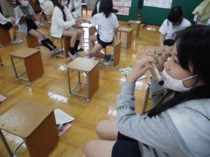 そして,今日は本物の「篠笛」の登場です。残念ながら吹くことはできませんが,実際に持ってみて吹く真似をしました。右手で穴を押さえる時は,指の腹ではなく第一関節と第二関節の間で穴を押さえることも知り,リコーダーに慣れているみんなにとっては初めての持ち方でしたが,近くの人たちでアドバイスをしながら,楽しい篠笛体験をしました。