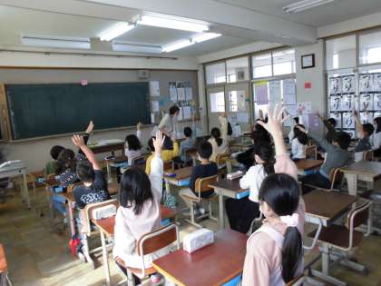 今日は,食育の授業で大豆のひみつをさぐりました。国語の「すがたをかえる大豆」でも大豆のことを学んでいるところなので,子ども達は,質問されたことに対して積極的に手を挙げて発表していました。国語の教科書にはのっていない,大豆のパワーにもついて学ぶことが出来ました。大豆は,給食にもいろいろな献立に登場します。これから,食べる前に献立に大豆が使われているかどうか,みんなで確かめていきたいと思います。ご家庭の食事でも,大豆が登場するときは,ぜひ子ども達に教えてあげてください。
