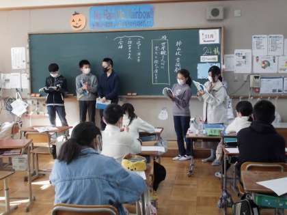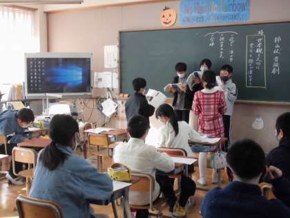 今日も朝,教室を回っていると6年生が国語の「柿山伏」の