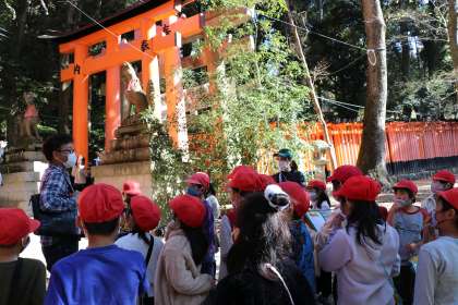 千本鳥居を背景にお話を聞いたり,質問をしたりしました。