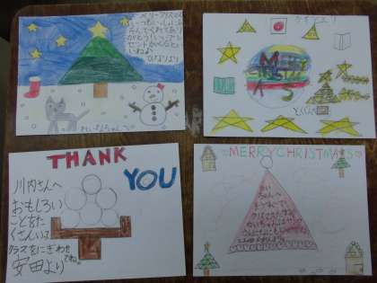 外国語活動では,グリーティングカードをつくって,友だちとこうかんしました。相手にカードをわたす前に,自分のカードにえがいた絵の形や色を英語で紹介しました。みんな様々な形や色の英語がたくさん使えましたね。心のこもったすてきなカードをもらい,とてもハッピーな気分になりました。