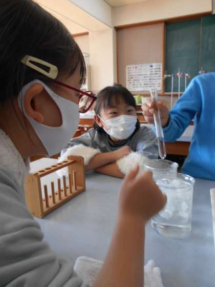 お湯につけた試験管のまくが,膨らんだ瞬間「おー!!」と歓声の声があちらこちらであがっていました。