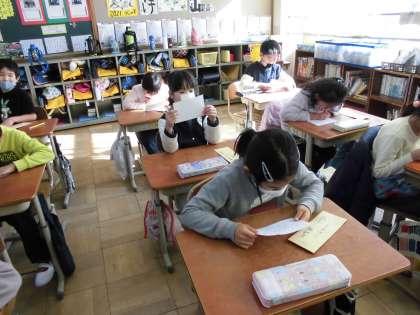 生活科の学習「ひろがれ わたし」はまず「今のわたし」から始まりました。今日はおうちの方にお願いしていた「ここがすてきカード」をまず全員に渡しました。みんなちょっと恥ずかしそうなでも食い入るような表情で読んでいました。