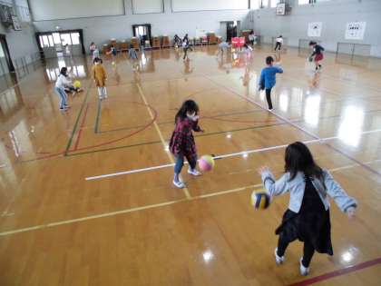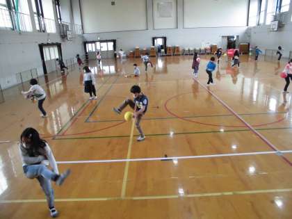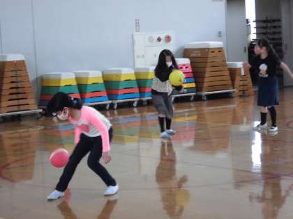 緊急事態宣言が出されてから,また音楽の学習はできることが限られているのですが,ちょうど「日本のふしでつながろう」という単元に入り,「あんたがたどこさ」のまりつき唄が登場しました。これなら体育館でゆったりと間隔をとればできるというわけで,今日で2回目に挑戦しました。水曜日の1回目のときは,ボールの上で足をまわすどころか,普通にボールを曲に合わせてつくのもおぼつかない子たちが多かったのですが,今日はずいぶん上手につけるようになっていました。子どもたちの吸収力の高さに驚かされます。