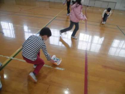この作品は転がして,その動きを楽しむものなので,今日は体育館で作品を転がして遊びました。転がると,動きが面白かったり,模様がきれいに見えたりして,教室で飾っているのとは違った発見がありました。