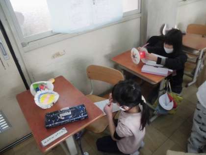 図画工作では,「かみざら コロコロ」という工作をしました。