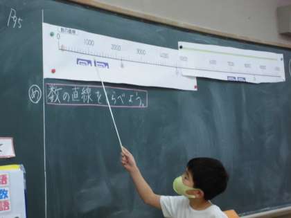 今日の算数は「10000までの数直線をしらべよう」というめあてで学習しました。1年生の時から何回も出会っている数の直線ですが,目盛りを正しく読みとることは子どもたちにとってはなかなかむずかしい課題です。今日もまず一番小さい一つ目の目盛りの大きさはどうしたら見つけられるのかについて,考えました。友達の説明もしっかりと聞けていました。