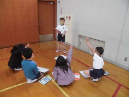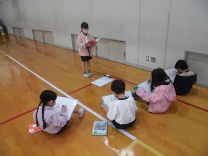 今日は体育館でグループに分かれてクイズ大会をしました。