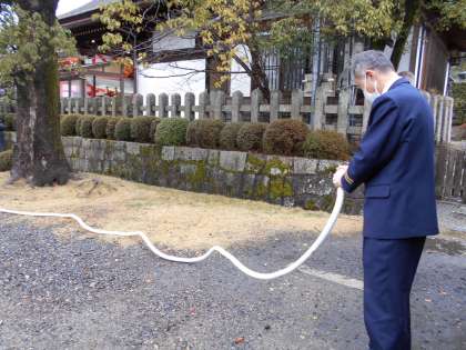 5,6時間目に総合的な学習で,地域にある稲荷大社はどのようにして守られているのか,ということを調べるためにフィールドワークを行いました。4年生の総合的な学習は,「住みよい町 稲荷」についてグループで調べ,まとめています。稲荷大社の歴史やその歴史を守るための防火施設にはどのようなものがあるのかについて,警備されている方に話を聞いたり,実際に放水したりして体験しました。