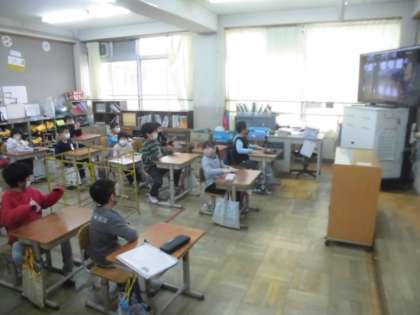 教室に戻ってからは,Zoomを使って,ほかの学年の発表を楽しみました。どの学年の発表も6年生への想いがつまっていて,1年生も画面に見入っていました。